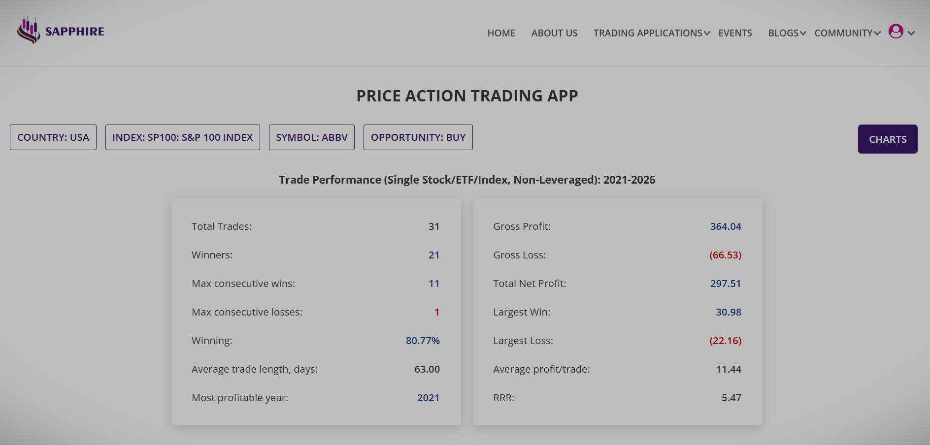 Each of the Stocks or ETFs listed in the summary report can be drilled down to a detailed report. The detailed report has two tables, the one at the top contains the aggregated trade performance for the number of Price Action events occured during the period of analysis. There are several parameters of interest included such as maximum consecutive wins, winning percentage, gross profit, net profit and reward-risk ratio (RRR).