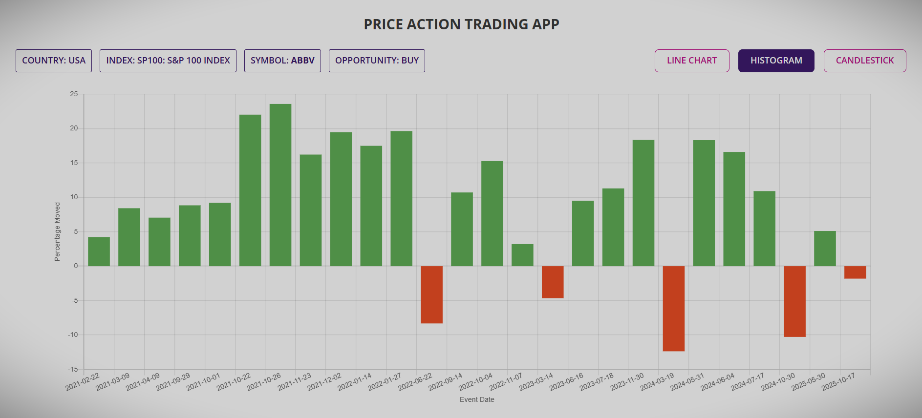 Histogram chart provides a complete picture of all Price Action events for the number of years of analysis and the percentage movement of the price in each of those events.