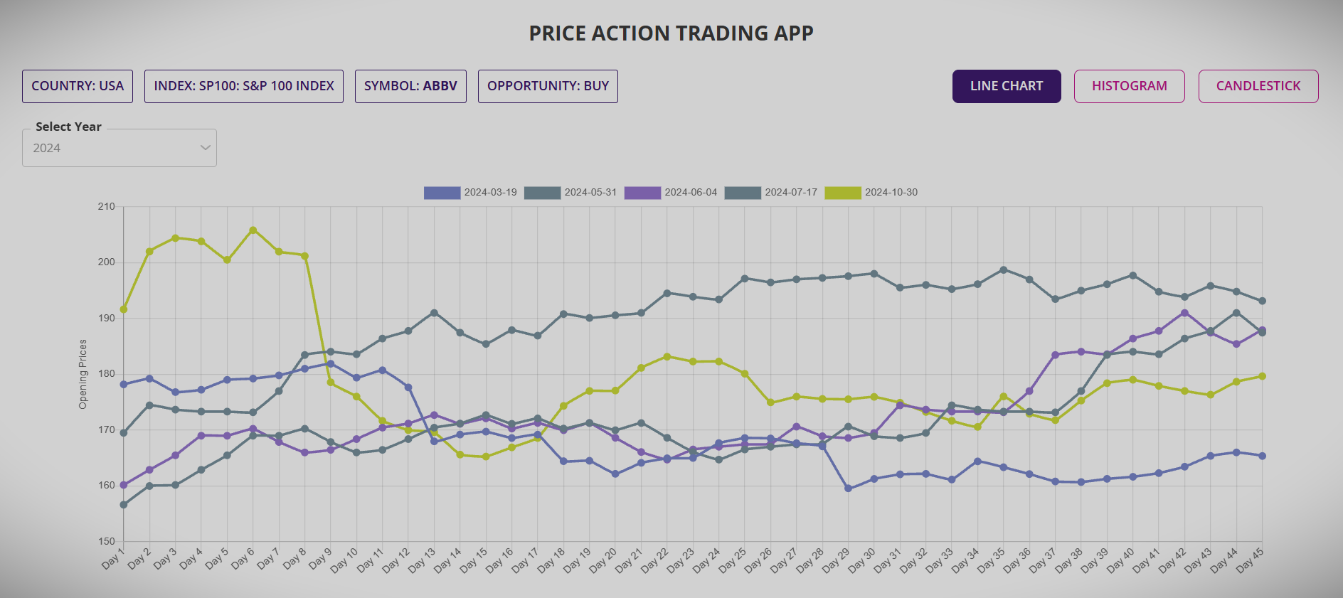 The interactive charting options provide even better insight into each of the past Price Action events. The line chart summarises all the events for each year of analysis and how the underlying price moved after the Price Action event.