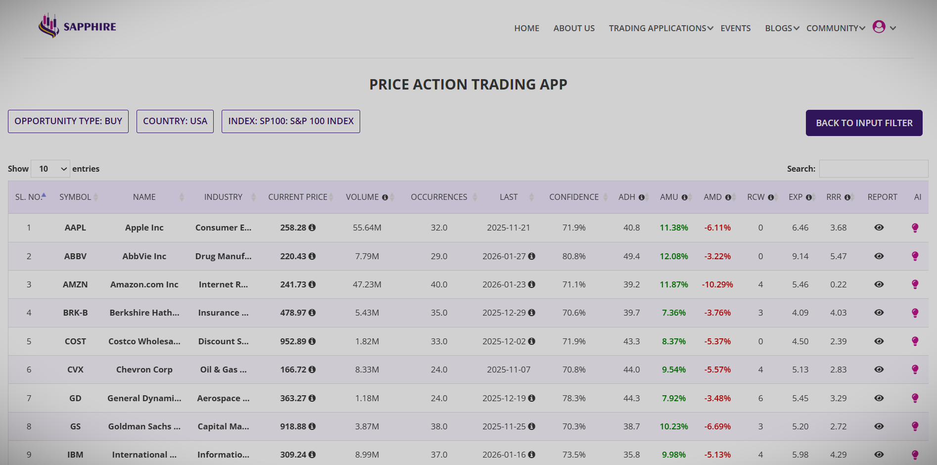 With the user selection of the country and index, lookback period, minimum required confidence, the Price Action app begins to look into the stock database for recent and past Price Action patterns to produce a summary report of all available opportunities. The summary report provides all possible open and closed trades with dates of occurence of the Price Action patterns and parameters of interest such as confidence, average move up, average move down, time taken to reach those levels and couple other parameters.