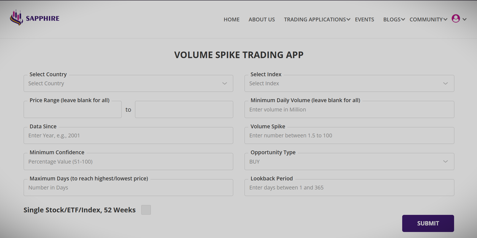 With the user selection of the country and index, look back period, minimum required confidence, the Volume spike trading app begins to look into the stock database for recent and past Volume spikes and patterns around it to produce a summary report of all available opportunities. The summary report provides all possible open and closed trades with dates of occurence of Volume spikes and parameters of interest such as confidence, average move up, average move down, the time taken to reach those levels or average days held and couple other proprietary parameters.