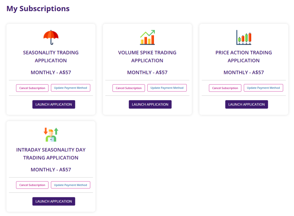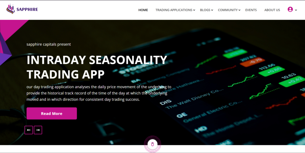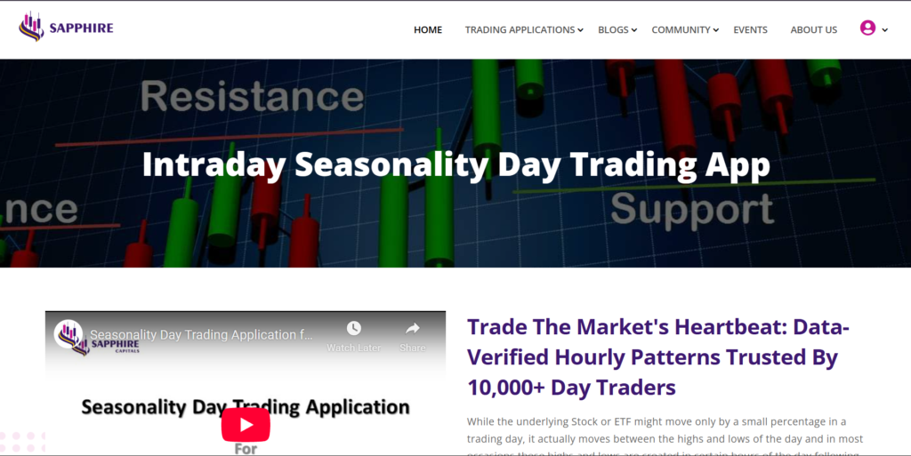 Please go to the top of Sapphire Capitals portal and from the pull-down menu under TRADING APPLICATIONS, select Seasonality Day Trading. This will take you to the Intraday Seasonality day trading app information page shown below.